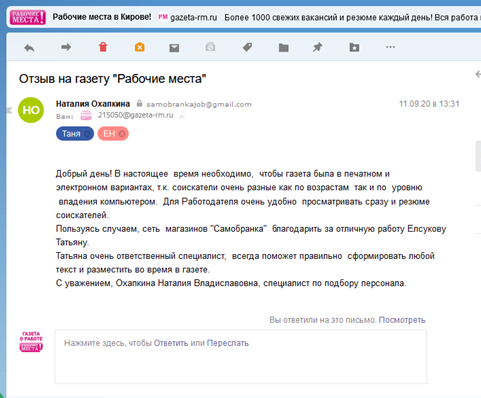 В подборе персонала мы исходим из принципа результативности. Если бы не было положительного результата от размещения рекламы в газете «Рабочие места», то мы бы туда не обращались. В рейтинге изданий, с которыми мы сотрудничаем, газета «Рабочие места» занимает одно из первых мест.